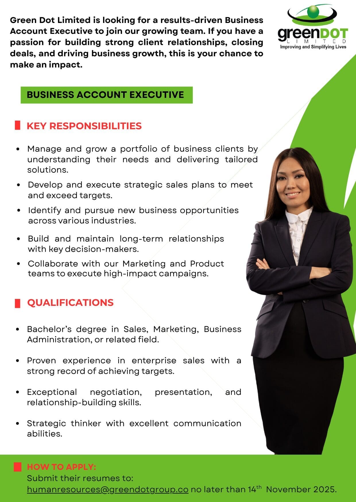 Green Dot Limited is seeking a suitably qualified Business Account Executive.