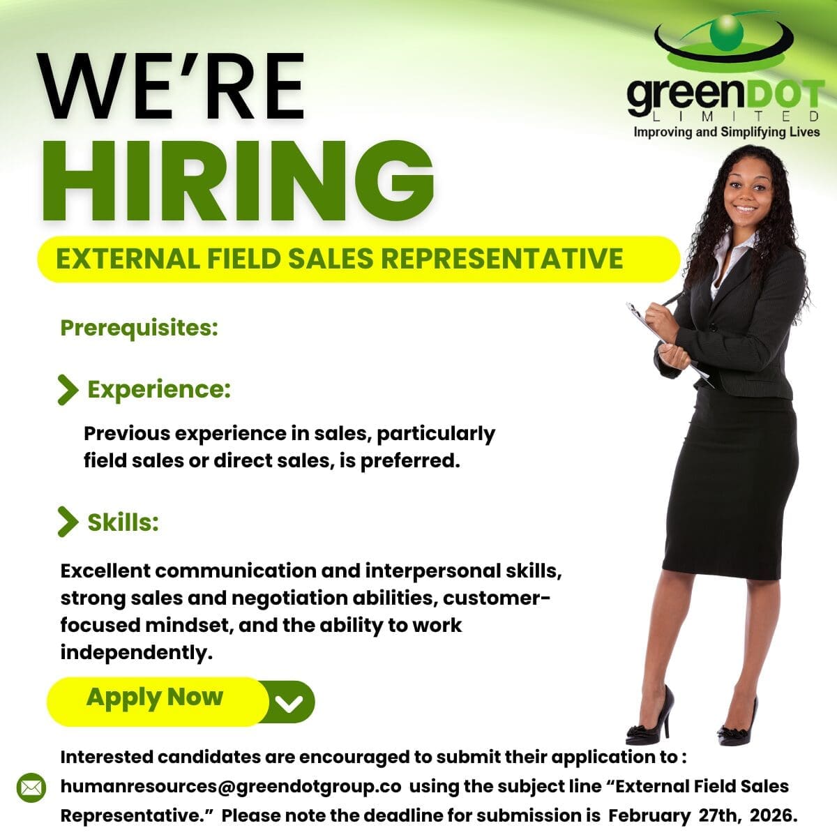 Green Dot Limited is seeking a suitably qualified External Field Sales Representative.