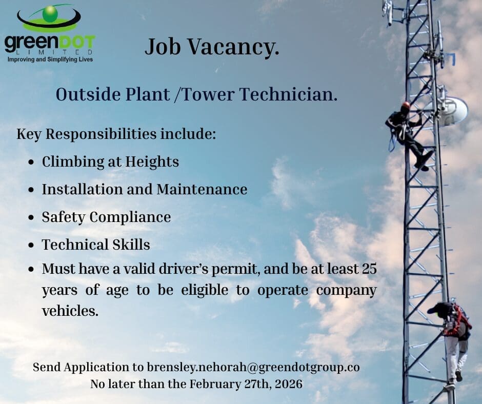 Green Dot Limited is seeking a suitably qualified Outside Plant/Tower Technician.
